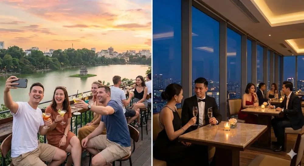Rooftop bar: Prioritizing open space and airy outdoor atmosphere. The vibe is usually comfortable, suitable for spontaneous skyline photos, with a style ranging from casual to smart casual.